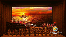 《一带一路》文艺晚会最精彩的一幕。在《千年之约》节目中我们看到了真实演员与虚拟影像的互动结合、形成了我们所说的全息效果,这是艺术和科技的结合,以往的这种全息效果都是采用投影来实现的,而这次却有很大不同、竟然用的都是小间距led显示屏和全息膜、大胆的进行了改良设计实现出来的效果。现场制作了一个长18米、高7米的全息车台,中间留空12米长3米高的空间为演员进行表演用,那么虚拟影像、真实演员、灯光,是如何做到衔接天衣无缝、虚拟和现实完美结合的呢?
