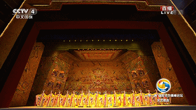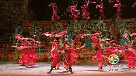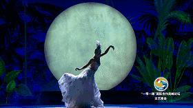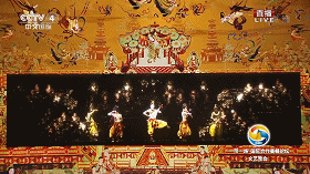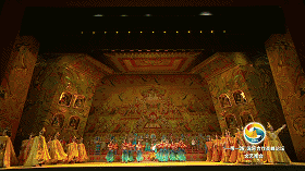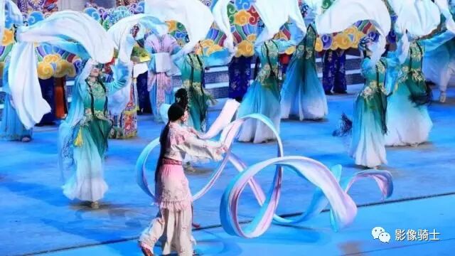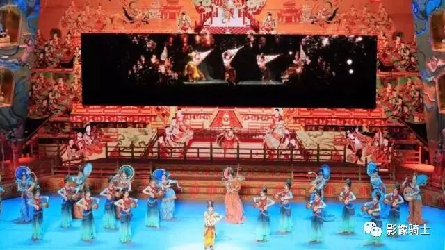大幕一拉开,观众发现置身于东方艺术瑰宝、敦煌莫高窟的宫殿之中,各种艺术形象翩然起舞,再现大唐盛世,也表达中国张开怀抱,欢迎“一带一路”沿线上的各国嘉宾。
