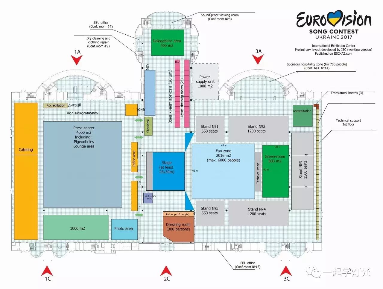 整个场馆被分成了三大部分,左侧的杏黄色区域是食堂,对,不吃饱了怎么high啊!接下来是巨大的媒体工作区。中间的一长条才是演出部分,从上到下依次是500㎡的各国代表团工作区,粉色的是选手更衣间,中间的25m×30m的浅蓝色方块才是舞台,浅棕色带个缺口的区域是舞裙更衣室和化妆间。右侧浅蓝色是2016㎡的内场观众区最多容纳6000人。在绿色的演员休息区和内场之间是技术人员席位,其它五个浅灰色的地方都是观众席。