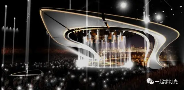 整个场馆被分成了三大部分,左侧的杏黄色区域是食堂,对,不吃饱了怎么high啊!接下来是巨大的媒体工作区。中间的一长条才是演出部分,从上到下依次是500㎡的各国代表团工作区,粉色的是选手更衣间,中间的25m×30m的浅蓝色方块才是舞台,浅棕色带个缺口的区域是舞裙更衣室和化妆间。右侧浅蓝色是2016㎡的内场观众区最多容纳6000人。在绿色的演员休息区和内场之间是技术人员席位,其它五个浅灰色的地方都是观众席。